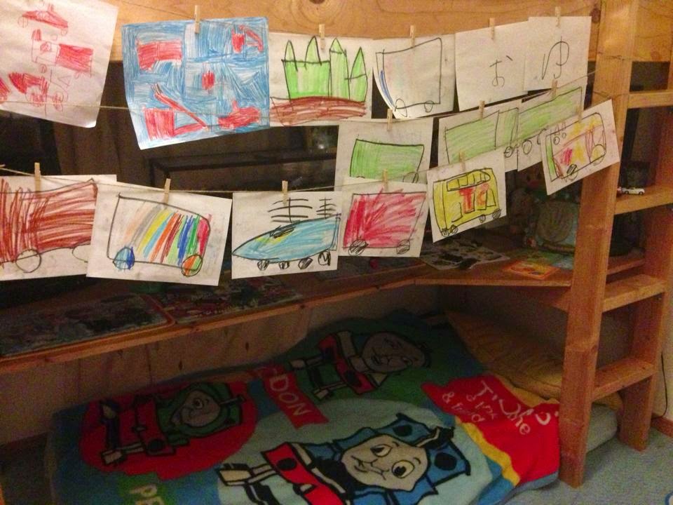 Fiz também um varal na sua cama pra ele pendurar suas obras de arte, toda semana vamos à biblioteca pública e ele passa horas olhando os livros.